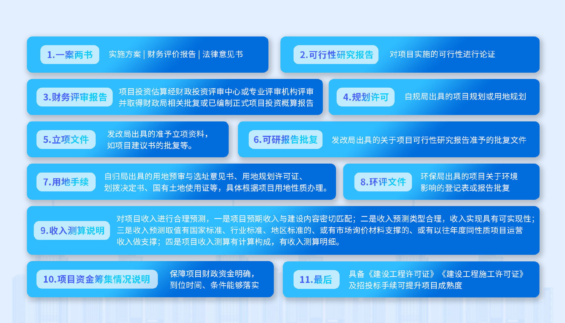 一是由專(zhuān)業(yè)機(jī)構(gòu)撰寫(xiě)的項(xiàng)目實(shí)施方案(具體包括項(xiàng)目概況、投資測(cè)算、收益測(cè)算、平衡分析和測(cè)算附表),切忌方案強(qiáng)行平衡;