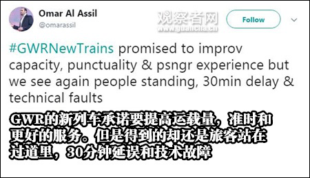 這讓旅客抱怨道:GWR的新列車承諾要提高運載量,準時和更好的服務。但是得到的卻還是旅客站在過道里,30分鐘延誤和技術故障。