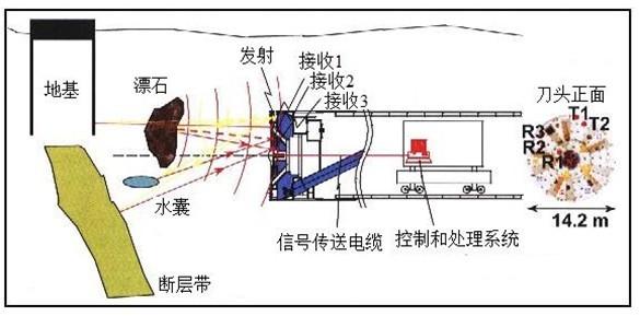 在盾構(gòu)機(jī)或TBM上安裝超前地質(zhì)預(yù)報(bào)設(shè)備,一直是機(jī)械開挖的目標(biāo)和方向,但目前的盾構(gòu)機(jī)和TBM基本上還沒有這方面的設(shè)備。日本一些學(xué)者,做過一些SSP(Sonic Soft Ground Probing)聲波前方預(yù)報(bào)的試驗(yàn)工作(見下圖),但目前仍沒有更深入的研究成果和更成熟的經(jīng)驗(yàn)。