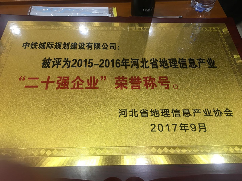 為表彰和獎勵2015--2016年度在全省地理信息生產和科技進步中做出突出成績的會員(企業)單位,推進企業單位三個文明建設,根據《河北省地理信息產業二十強企業評選辦法》和《關于開展河北省地理信息產業二十強企業評選活動的通知》(冀地信協〔2017〕2號)精神,由具有企業測繪資質的單位申報,經河北省地理信息產業協會各市聯絡處審核,組織二十強企業評審專家評審,報省地理信息局同意,共評選出全省地理信息產業二十強企業20家,中鐵城際規劃建設有限公司榜上有名。