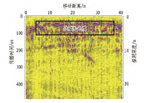 隧道內(nèi)電纜對(duì)地質(zhì)雷達(dá)探測(cè)干擾較大,容易造成誤判。電纜通常布置在隧道邊墻,在進(jìn)行底板下方不良地質(zhì)體探測(cè)時(shí),測(cè)線(xiàn)方向與電流方向平行,天線(xiàn)的極化方向垂直于電流方向,如圖4 所示,其在地質(zhì)雷達(dá)圖像上表現(xiàn)為1 組反射強(qiáng)烈的水平同相軸[14]。在底板探測(cè)時(shí),需要注意輸電線(xiàn)路與測(cè)線(xiàn)之間的相對(duì)位置,并記錄下來(lái)。