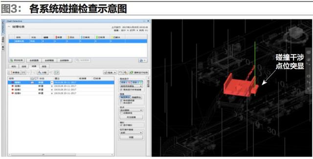 5.參照后的項目文件參照完成后可在項目中進行各系統(tǒng)模型的碰撞檢查(如圖3),預(yù)先檢查出各干涉點位,把問題解決在設(shè)計的初級階段,減少后期的返工和整改,從而保證項目設(shè)計質(zhì)量,減少整個項目的運營成本。