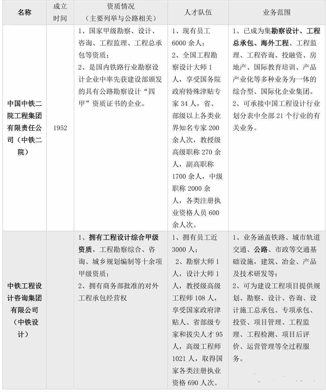 表2:中鐵體系下與公路勘察設(shè)計(jì)相關(guān)的全資子公司基本情況