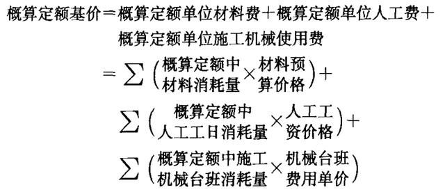 采用擴大單價法編制概算,首先應根據概算定額編制擴大單位估價表(概算定額基礎價)。概算定額是按一定計算單位規定的、擴大分部分項工程或擴大結構部門的勞動、材料和機械臺班的消耗量標準。擴大單位估價表是確定單位工程中各擴大分部分項工程或完整的結構所需全部材料費、人工費、施工機械使用費之和的文件。計算公式為: