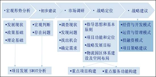 我們根據多年的工作經驗,總結了自己使用的物流園區項目戰略規劃和定位研究的一般方法論(如下圖所示),并要做好以下工作: