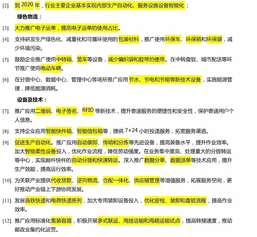 新增、擴(kuò)建、改造物流樞紐、分撥中心、快遞園區(qū)、國際處理中心、海外倉等重要基礎(chǔ)設(shè)施,內(nèi)部設(shè)備實(shí)現(xiàn)節(jié)能、環(huán)保、智能、信息化、自動(dòng)化。(具體數(shù)量地址等信息詳見后文詳情)