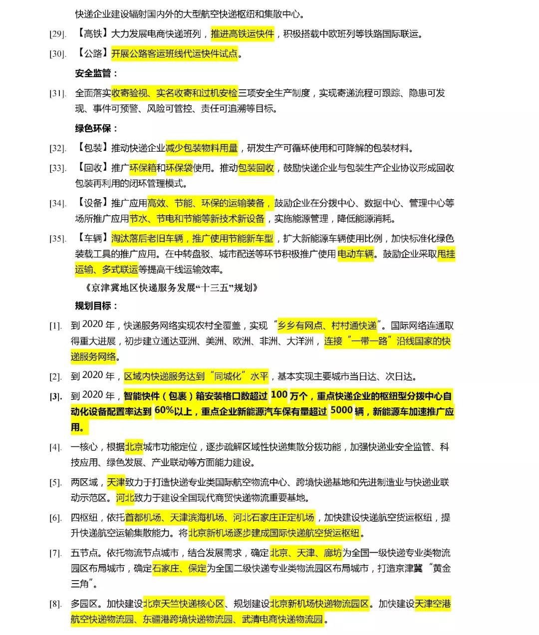 (3)到2020年,京津翼地區(qū),智能快件(包裹)箱安裝格口數(shù)超過100萬個(gè),重點(diǎn)快遞企業(yè)的樞紐型分撥中心自動(dòng)化設(shè)備配置率達(dá)到60%以上,重點(diǎn)企業(yè)新能源汽車保有量超過5000輛,新能源車加速推廣應(yīng)用。