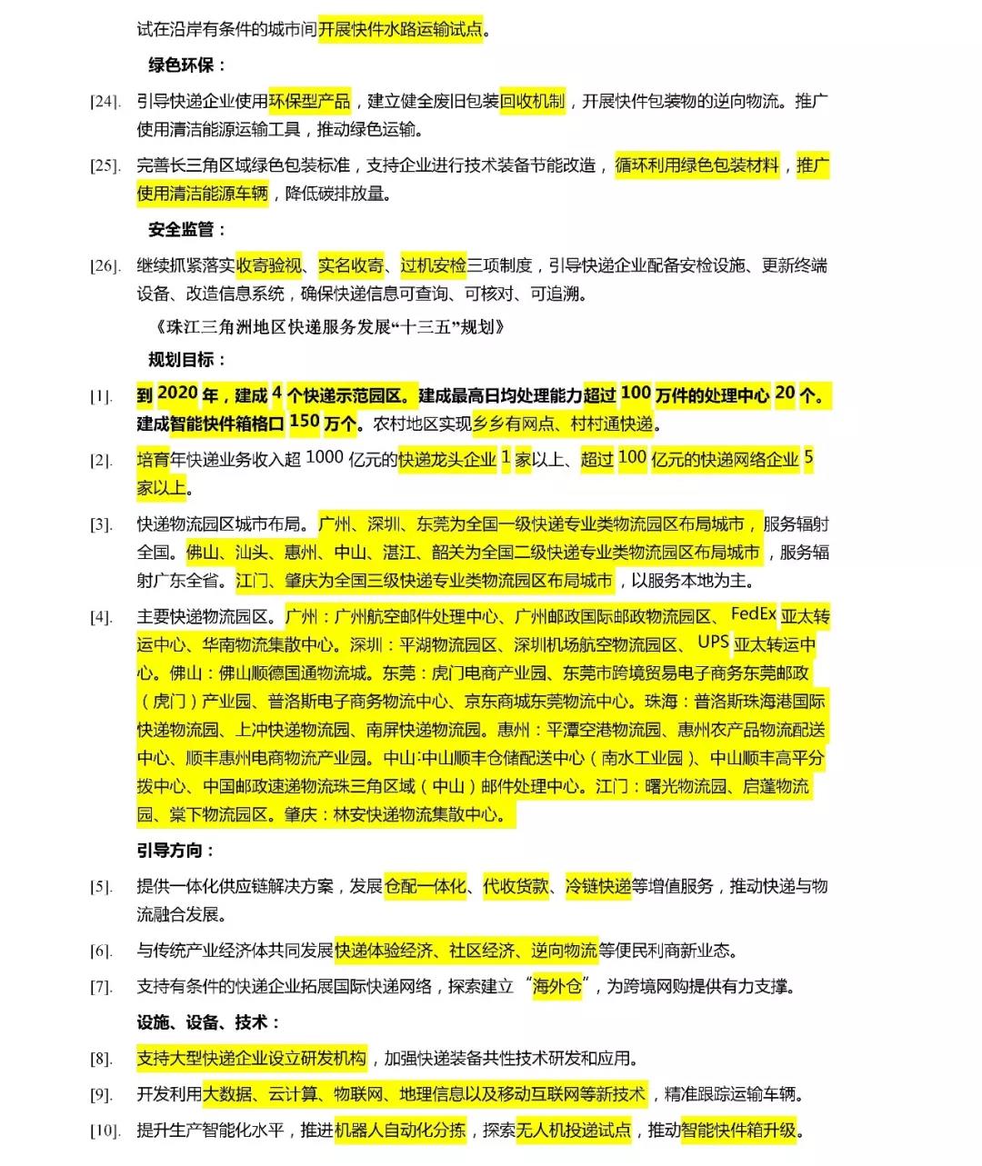 (5)到2020年,珠三角地區(qū),建成4個(gè)快遞示范園區(qū)。建成最高日均處理能力超過100萬件的處理中心20個(gè)。建成智能快件箱格口150萬個(gè)。