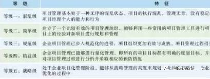 設計院向工程公司轉型升級,需要提升管理能力,如項目管理能力、商務和法律能力、專業(yè)采購和分包管理能力、信息化建設和運用能力等,這都是擺在傳統(tǒng)設計院面前的新課題。特別是項目管理能力的打造,是能否實現(xiàn)轉型的關鍵,只有真正具備了較為完善的項目管理能力,企業(yè)才能以工程公司模式順暢運作。根據(jù)項目管理理論,企業(yè)的項目管理能力可分為5個等級,見表1。