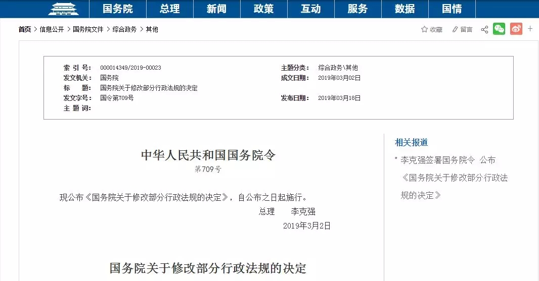 2019年3月18日,中國國務院總理李克強簽署國務院令,公布《國務院關于修改部分行政法規的決定》(以下簡稱《決定》),自公布之日起施行。