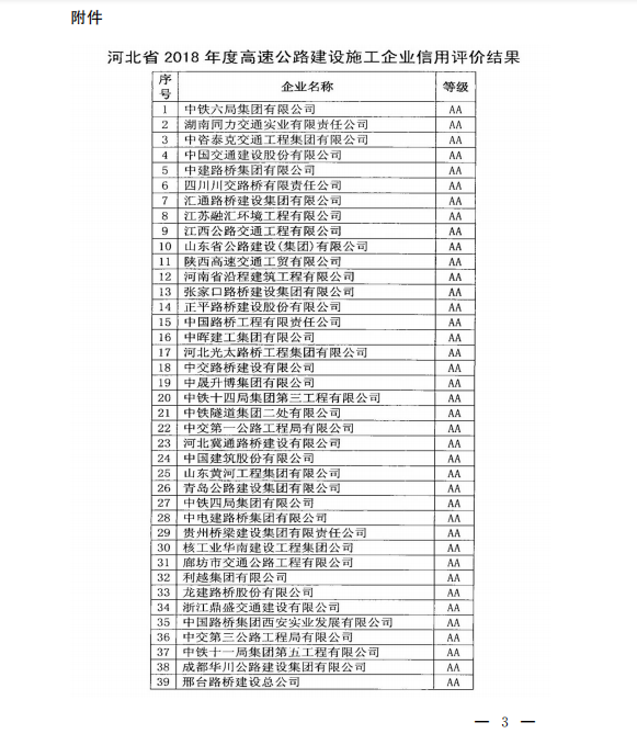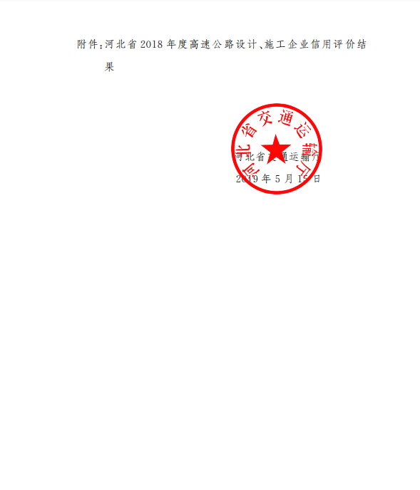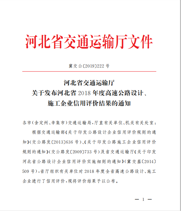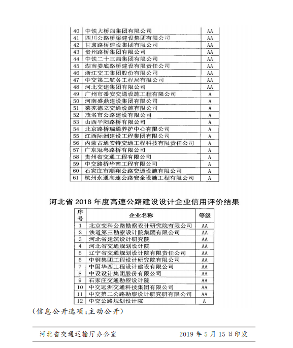 河北省交通運(yùn)輸廳關(guān)于發(fā)布河北省2018年度高速公路設(shè)計(jì)、施工企業(yè)信用評價結(jié)果的通知