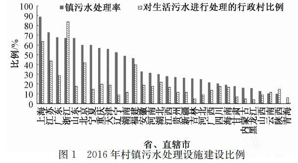 村鎮污水處理在我國剛剛起步,污水處理設施建設落后于經濟發展的速度。截至2016年底,全國對生活污水進行處理的建制鎮比例為52.64%,也就是說全國有18 099個建制鎮,其中13 028個沒有污水處理設施,同時已建成的污水處理設施不到一半尚可正常運行;對生活污水進行處理的行政村占20%。仍有大量地區的農村污水處理設施處于空白。圖1表明各省市行政村污水處理設施建設情況,地區差異較為明顯。上海、江蘇、浙江、山東等省市建制鎮污水處理率較高的地區可達到89.18%,行政村比例達到64%、44%、84%和18%,西北、東北地區僅為0.01%~25.7%。考慮到農村污水治理建設費用巨大、農村管理能力不足等因素,參照國外發達國家治理歷程,全面實現農村污水治理還需較長時間努力。當前,在大幅度提高建制鎮污水處理率基礎上,重點推動經濟發達地區、生態環境敏感、人口密集等地區農村污水治理,梯次推進農村生活污水治理。