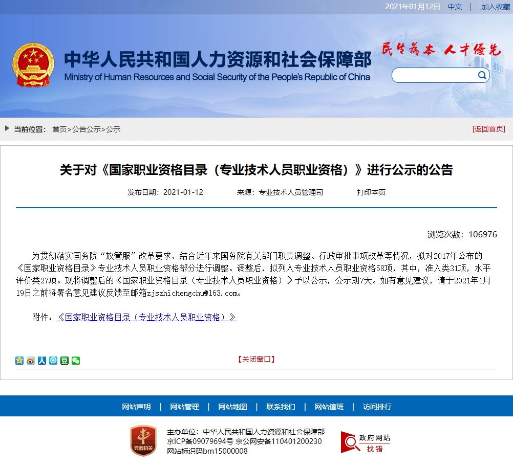 為貫徹落實國務(wù)院“放管服”改革要求,結(jié)合近年來國務(wù)院有關(guān)部門職責(zé)調(diào)整、行政審批事項改革等情況,擬對2017年公布的《國家職業(yè)資格目錄》專業(yè)技術(shù)人員職業(yè)資格部分進(jìn)行調(diào)整。調(diào)整后,擬列入專業(yè)技術(shù)人員職業(yè)資格58項,其中,準(zhǔn)入類31項,水平評價類27項。現(xiàn)將調(diào)整后的《國家職業(yè)資格目錄(專業(yè)技術(shù)人員職業(yè)資格)》予以公示,公示期7天。如有意見建議,請于2021年1月19日之前將署名意見建議反饋至郵箱zjszhichengchu@163.com。