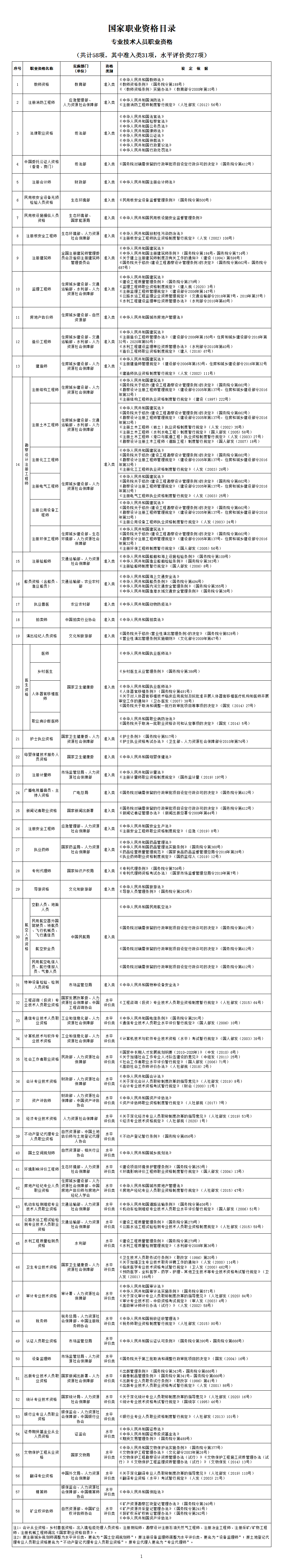 注1:會計從業(yè)資格,鄉(xiāng)村獸醫(yī)資格,出入境檢疫處理人員資格,注冊測繪師,勘察設(shè)計注冊石油天然氣工程師、注冊冶金工程師、注冊采礦/礦物工程師、注冊機(jī)械工程師調(diào)出《國家職業(yè)資格目錄》。