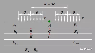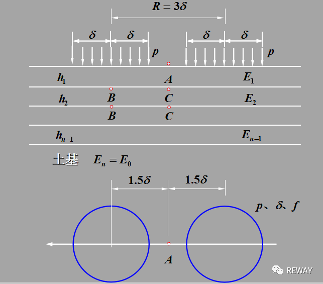 層底拉應(yīng)力以單圓中心 (B點)及雙圓輪隙中心 (C點)為計算點,并取較大值作為層底拉應(yīng)力。按式(8.0.13)計算層底最大拉應(yīng)力: