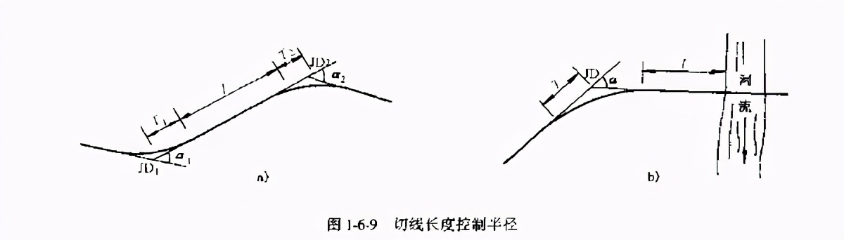 平曲線半徑的選定,除受地形、地物制約外,有時還應(yīng)考慮如何適應(yīng)前后線形的要求。如當(dāng)同向或反向曲線間直線長度較短時,為解決曲線敷設(shè)與銜接,通常采用限制切線長度的方法來推求平曲線半徑,如圖1-6-9a)。橋梁或隧道兩端的曲線起、終點到橋頭或隧道口應(yīng)留有一定長度的直線段,如圖1-6-9b).此時平曲線半徑也應(yīng)根據(jù)切線來選定。