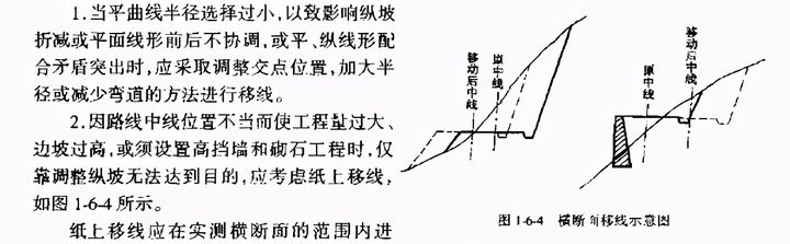 在公路定線過程中,往往由于定線時考慮不周、地形條件限制或其他原因,難免產(chǎn)生因平面中線位置不當(dāng)致使工程量過大、標(biāo)準(zhǔn)或線形不夠理想等缺點。此時可在分析研究已定路線平、縱、橫圖紙資料的基礎(chǔ)上,考慮移動路線,使設(shè)計達(dá)到經(jīng)濟(jì)合理的要求,它對提高設(shè)計質(zhì)量,降低工程費用起著一定的作用。當(dāng)路線設(shè)計出現(xiàn)以下情況時,應(yīng)考慮紙上移線。