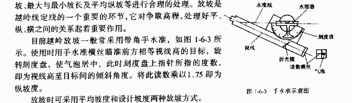按平均坡度放坡:根據(jù)《公路工程技術(shù)標(biāo)準(zhǔn)》規(guī)定的平均坡度值5.0%—5.5%(按相對高差而定).視具體地形確定適當(dāng)?shù)目v坡度,然后實地放坡。按平均坡度放坡只起到在一定長度范圍內(nèi)控制高差和水平距離的作用,優(yōu)點是放坡速度快,但沒有反映公路等級對平均縱坡的不同要求以及地形、地質(zhì)變化的情況。