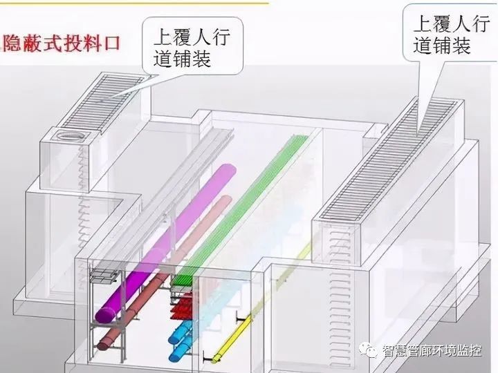 吊裝口是管線、電纜進入管廊的通道,分剛性管道吊裝口和纜線吊裝口,不能一概而論,大多采用地上式做法,如下圖所示。這種做法最大的弊端就是對景觀影響大。較好的做法是針對管線、電纜吊裝的特性分別設置吊裝口,且剛性管道隱蔽式吊裝口和地上式結合設置,一般一條線路上采用一個地上式,其余均為隱蔽式,這樣既 解決了管線安裝又最大限度降低環境影響。