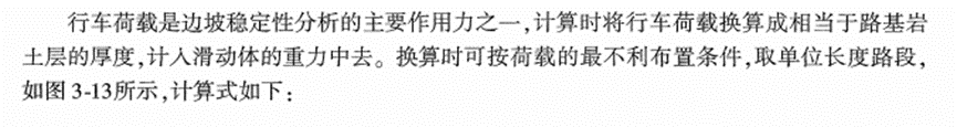 在《公路路基設(shè)計(jì)規(guī)范》(JTG D30-2015)中沒有發(fā)現(xiàn)對(duì)邊坡穩(wěn)定計(jì)算時(shí)行車荷載如何考慮的條文,但是在《路基路面工程》(黃曉明版)和《公路軟土地基路堤設(shè)計(jì)與施工技術(shù)細(xì)則》(JTG/T D31-02-2013)中有相關(guān)表述。《公路軟土地基路堤設(shè)計(jì)與施工技術(shù)細(xì)則》4.1.4-4.1.6條的規(guī)定如下,即將行車荷載換算成土柱高度,可按車輛荷載均布于車輛投影面積上換算得出。