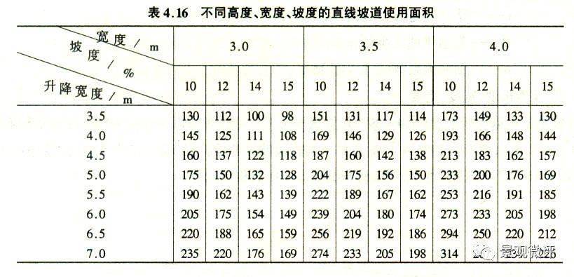 表4.14為坡道升降高度3.5~7.0 m,坡度為10%~15%條件下的直線(xiàn)坡道各段長(zhǎng)度。表4.16為不同長(zhǎng)度、寬度、坡度的直線(xiàn)坡道使用面積比較值。