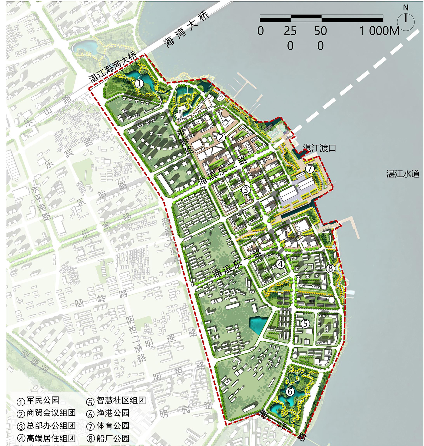 重點對七個核心片區進行詳細城市設計:海灣大橋以北環龍王灣三個核心片區,分別為赤坎商貿服務區、海東創新服務中心、沙咀海洋科技園。海灣大橋以南四個核心片區,分別為濱?;盍蹍^、南調低碳智慧園、麻斜海味半島、南三風情旅游。另外結合近期實施項目,對霞山中國海鮮美食城進行城市設計提升。
