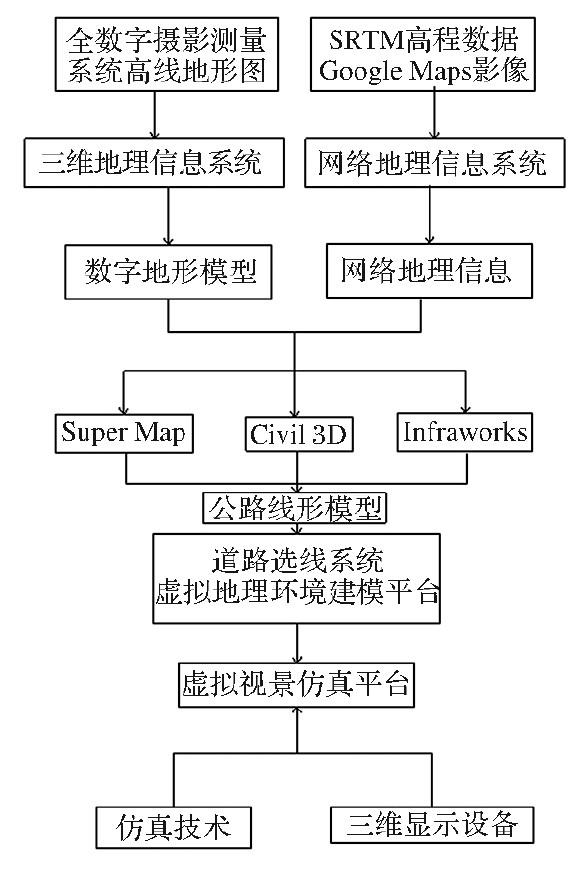 一方面,可通過SRTM高程數據、Google Maps影像等開放網絡地理信息資源的獲取與利用技術的研究;另一方面,利用全數字攝影測量系統,可通過航攝像片、衛星遙感影像、傾斜攝影快速獲取數字地形模型、正射影像地圖及數字等高線地形圖等數字地形資料。然后將獲取的地理信息和地形數據通過Civil3D、SuperMap、Infraworks等軟件平臺建立公路線形模型,同時利用仿真技術和三維顯示設備進行虛擬視景仿真體驗,并可對多種線路進行方案比選和對比分析。
