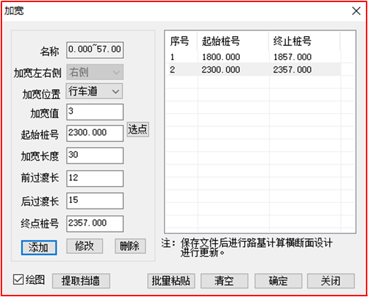 緯地軟件實(shí)現(xiàn)任意復(fù)雜線形設(shè)計(jì)3、批量設(shè)計(jì)錯(cuò)車道和斷面寬度變化針對低等級(jí)公路需要添加的錯(cuò)車道數(shù)量較多或者設(shè)置護(hù)欄時(shí)土路肩需要加寬的情況,緯地軟件增加了快速加寬設(shè)計(jì)功能。可根據(jù)加寬需求設(shè)置加寬名稱、加寬位置(含行車道、硬路肩、土路肩)、加寬值、加寬起終點(diǎn)樁號(hào)、加寬長度、過渡段長度等參數(shù),也可直接提取該項(xiàng)目的擋墻設(shè)置段落進(jìn)行加寬設(shè)計(jì)。