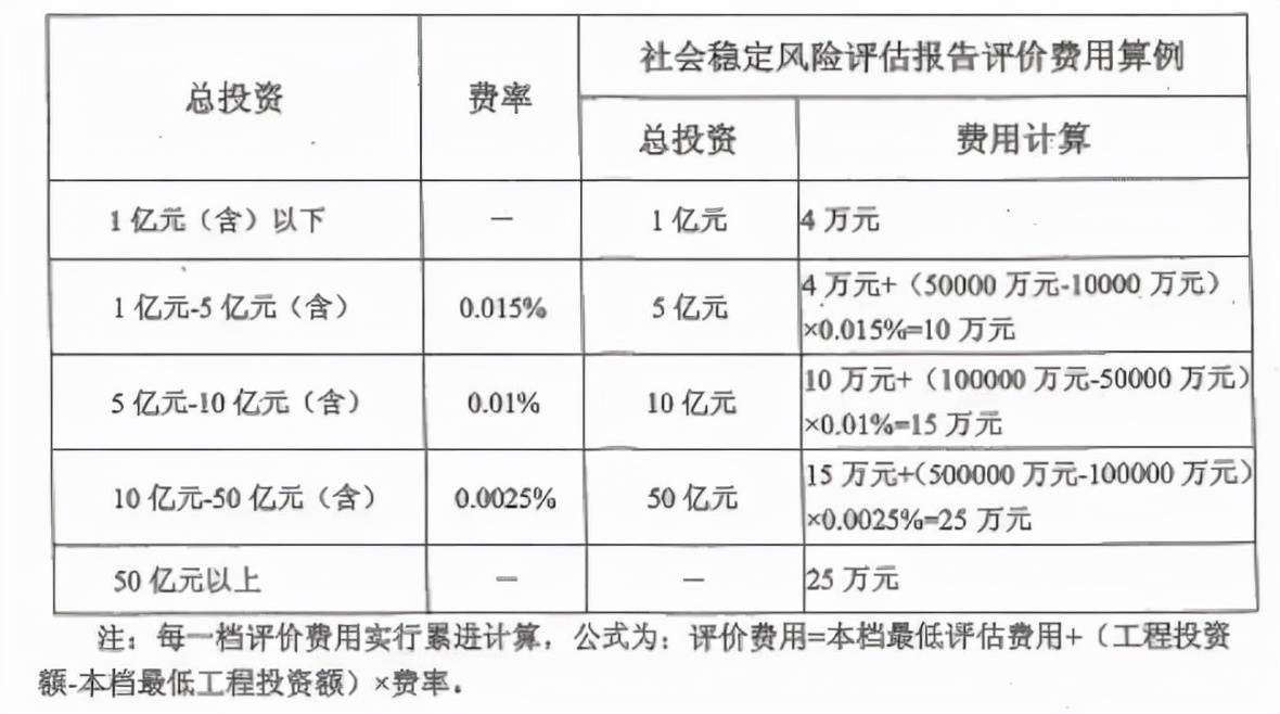 (2)評價建設(shè)項(xiàng)目穩(wěn)評報告的咨詢服務(wù)收費(fèi),以建設(shè)項(xiàng)目的估算總投資額為計(jì)費(fèi)基準(zhǔn),根據(jù)分檔費(fèi)率來綜合確定,費(fèi)用范圍在4萬至25萬元(詳見表5);