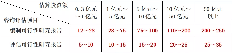 方法1:按建設(shè)項(xiàng)目估算投資額,分檔計(jì)算可行性研究報告編制和評估的咨詢服務(wù)費(fèi)用(詳見表1),并由工程咨詢機(jī)構(gòu)和委托單位根據(jù)各類項(xiàng)目復(fù)雜程度協(xié)商確定具體調(diào)整系數(shù)(詳見表2)
