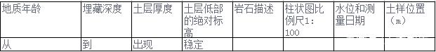 鉆孔地質(zhì)柱狀圖是表示該鉆孔所穿過(guò)的地層而綜合成圖表表示。圖中表示有地質(zhì)年代、土層埋藏深度、土層厚度、土層底部的絕對(duì)標(biāo)高、巖土的描述、柱狀圖、地面絕對(duì)標(biāo)高、地下水水位和測(cè)量日期、巖土怎樣選取位置等。柱狀圖的比例尺一般為1:100—1:500。
