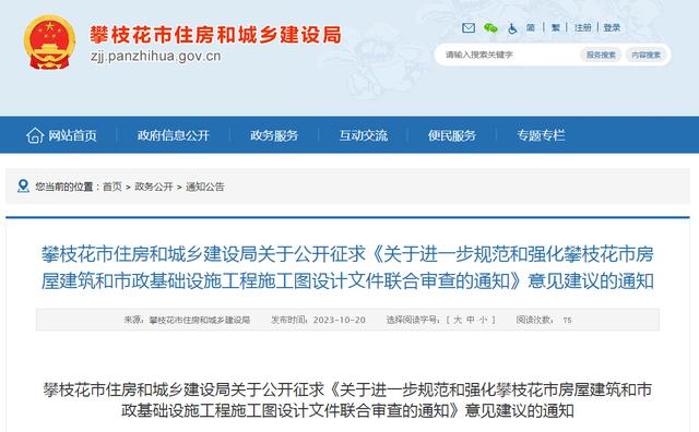 為貫徹落實國務院辦公廳《關于全面開展工程建設項目審批制度改革的實施意見》(國辦發〔2019〕11號)、《住房城鄉建設部關于推進工程建設項目審批標準化規范化便利化的通知》(建辦〔2023〕48號)等有關要求,進一步提升審批服務效能,更好滿足企業和群眾辦事需求,我局牽頭起草了《關于進一步規范和強化攀枝花市房屋建筑和市政基礎設施工程施工圖設計文件聯合審查的通知(征求意見稿)》,現向社會公開征求意見,請于2023年11月20日18:00前以書面或郵件形式反饋我局。