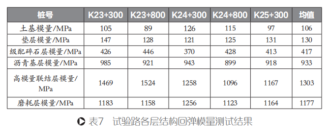 根據(jù)《公路路基路面現(xiàn)場測試規(guī)程》(JTG E60-2008),對(duì)試驗(yàn)路各層施工完成后進(jìn)行現(xiàn)場回彈模量試驗(yàn),其測試結(jié)果如表7所示。