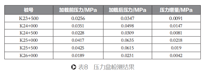 為測量長壽命瀝青路面試驗(yàn)路段土基頂面所受壓力,根據(jù)《公路路基路面現(xiàn)場測試規(guī)程》(JTG E60-2008)要求,在試驗(yàn)路行車道上埋置壓力盒,測取在10t軸載單輪下的壓力值,具體檢測結(jié)果如表8所示。