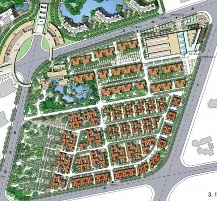 用地中間做環形道路,向外引出錯落的分支道路,形成各自獨立的組團,中心適宜做景觀。