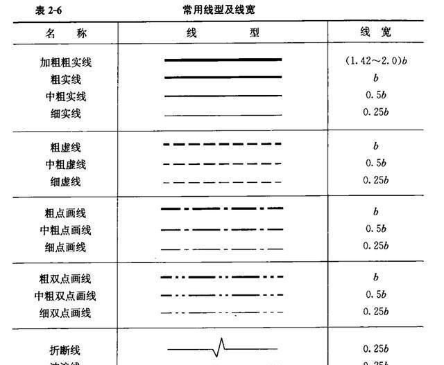 2)每張圖上的圖線線寬不宜超過3種?;揪€寬((b)應根據圖樣比例和復雜程度確定。線寬組合宜符合表2-5的規定.