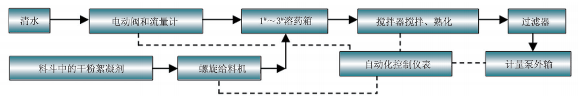在污水處理系統(tǒng)中,為了除去或降低水中懸浮物,使其產(chǎn)生大顆粒的凝聚體,加快水中雜質(zhì)和污泥沉降速度,一般在污水處理的沉降部分加入一定濃度的絮凝劑。用于含油污水處理的絮凝劑包括無機絮凝劑、有機絮凝劑和復合絮凝劑 3 大類。為了保證加藥濃度、減輕工人勞動強度和降低藥劑成本,應用絮凝劑自動加藥工藝技術。