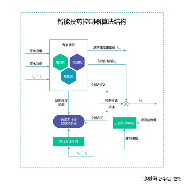 首先通過前饋專家模型采集分析源水流量、濁度、 PH 值 等數(shù)據(jù)信息并快速建模,再利用人工神經(jīng)網(wǎng)絡對模型進行深度學習,通過多步預測、滾動優(yōu)化和反饋校正識別出加藥量和變量之間的對應關系,最終得出最精準的藥劑投加量?;苍浦悄芗铀幭到y(tǒng)可通過軟件平臺對工藝過程進行全自動監(jiān)控、診斷,投藥全程自動化控制,設備故障自動進行切換控制;實現(xiàn)對設備運行、藥劑消耗、水質(zhì)監(jiān)控等方面進行實時診斷、數(shù)據(jù)分析、故障預測及報警 。